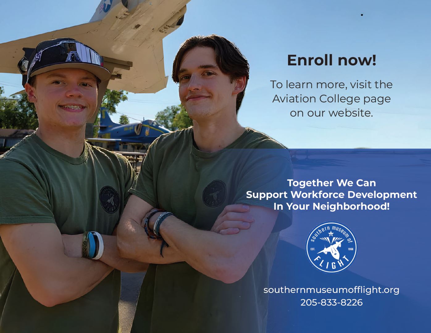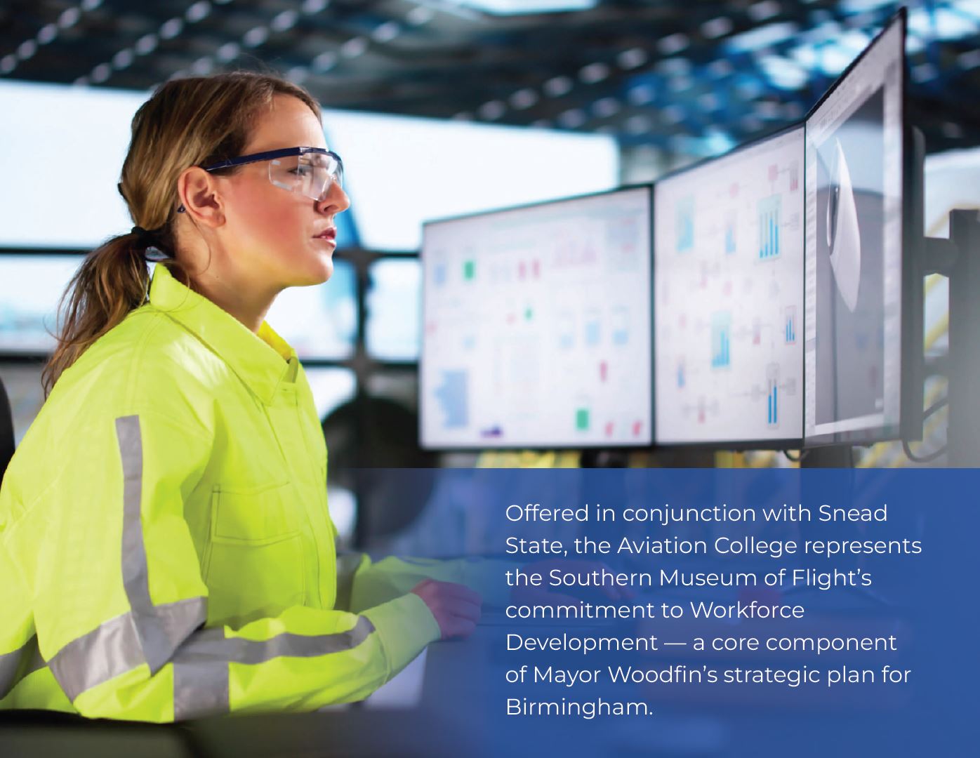 Offered in conjunction with Snead State, the Aviation College represents the museum’s commitment to Workforce Development — a core component of Mayor Woodfin’s strategic plan for Birmingham. The College's first class (which graduated Spring 2025, when we initiated a promotional campaign) had two students. Enrollment for the Fall 2025 semester was 25 students.